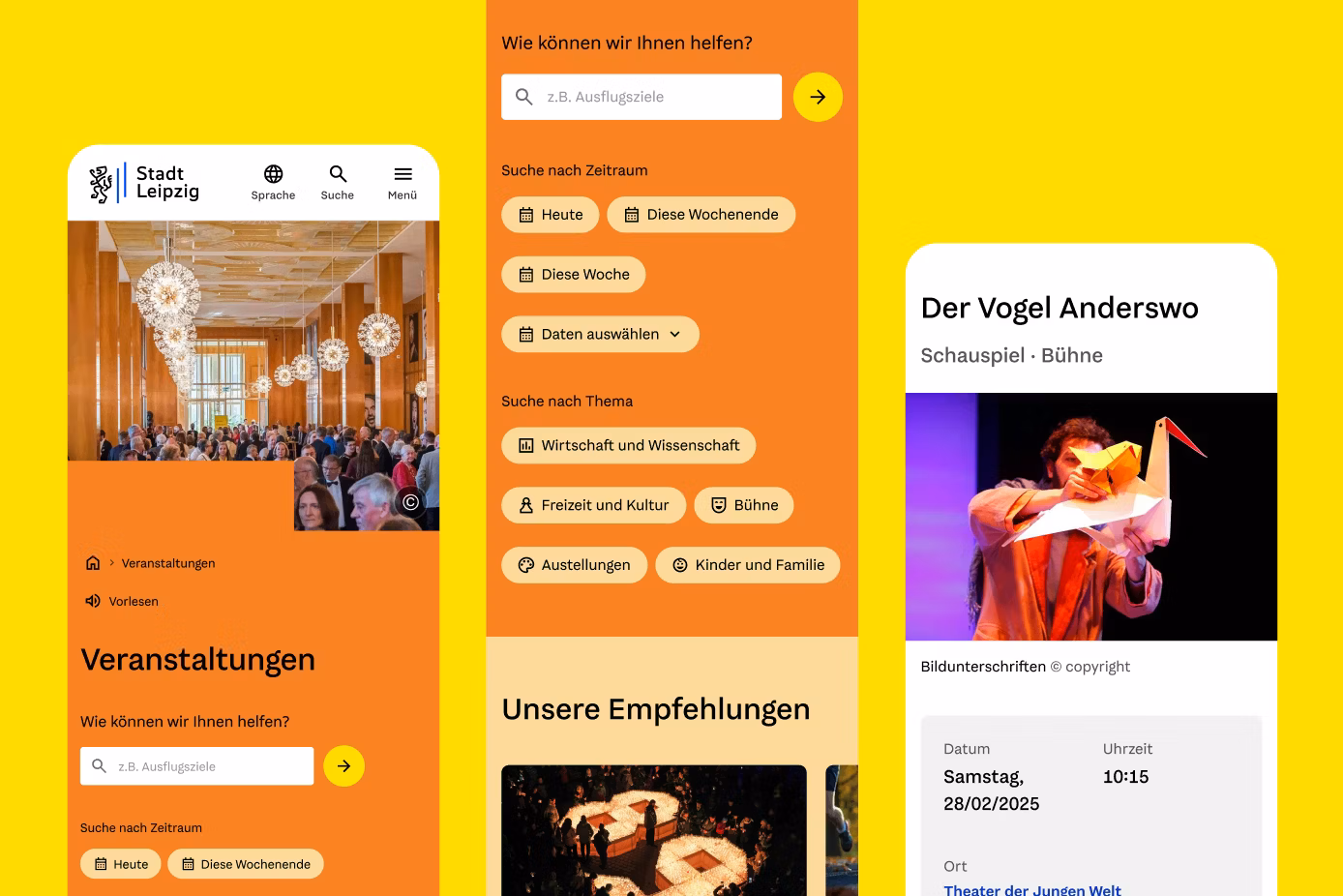 We developed the corporate design and the citizen portal in parallel with the identity providing guardrails while the portal served as the real-world proving ground. The structure of Leipzig.de had grown organically over its lifetime and was highly complex (400+ subtopics/pages). Our focus: efficient, contextual search and thematic entry points rather than mere menu reduction. Delivery was a team effort with the existing development partner DMK E-Business (Chemnitz), translating the design into operational reality and scaling it as a component-based system. The city complemented the process with an expert jury from universities, museums, enterprises, and tourism to ensure reach and buy-in.